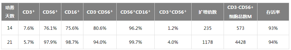 健康人的PBMC细胞按产品说明书进行细胞培养。细胞培养至14天/21天收获,进行细胞计数和检测。细胞使用CD3 APC / CD56 PE / CD16FITC抗体孵育后进行流式检测。